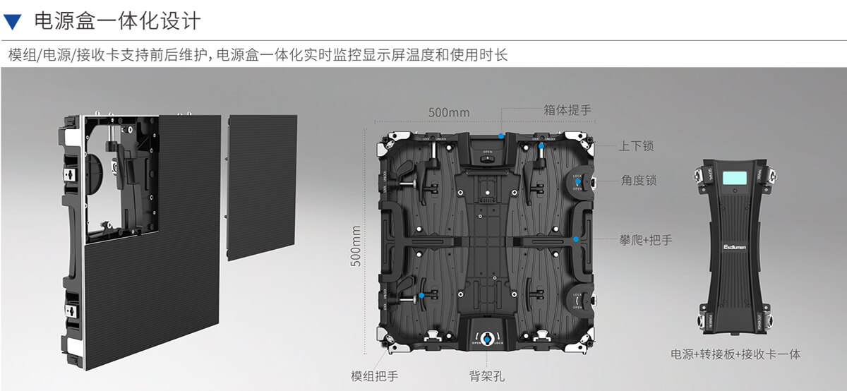 模組/電源/接收卡支持前后維護(hù),電源盒一體化實(shí)時(shí)監(jiān)控顯示屏溫度和使用時(shí)長(zhǎng)