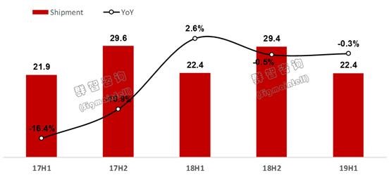2017~2019年中國市場電視整機(jī)半年度出貨數(shù)量及同比走勢 (Unit:百萬臺,%)