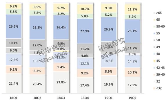 18Q1~19Q2中國市場電視尺寸結(jié)構(gòu)走勢(Unit:%)