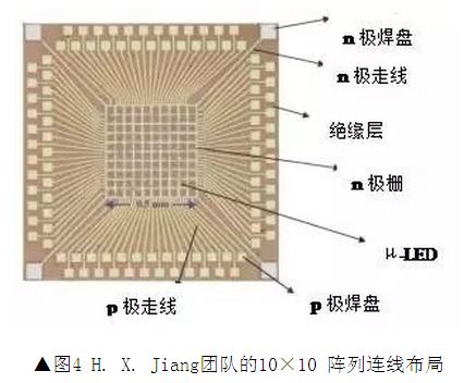 同年,H.X.Jiang團(tuán)隊(duì)也同樣做出了一個(gè)無源矩驅(qū)動(dòng)的10×10micro-LEDarray。這個(gè)陣列創(chuàng)新性的使用四個(gè)公共n電極和100個(gè)獨(dú)立p電極。并采用復(fù)雜的版圖設(shè)計(jì)以盡量最優(yōu)化連線布局。雖然顯示效果有一定的進(jìn)步,但沒有解決集成能力低的問題。