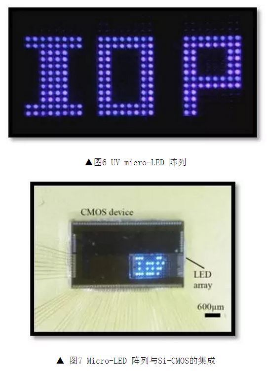 而同年Z.Gong團(tuán)隊(duì)公布的微陣列,依然采用無源矩陣驅(qū)動(dòng),并使用倒裝焊技術(shù)集成。該團(tuán)隊(duì)做出了藍(lán)光(470nm)micro-LED陣列和UVmicro-LED(370nm)陣列,并成功通過UVLED陣列激發(fā)了綠光和紅光量子點(diǎn)證明了量子點(diǎn)彩色化方式的可行性。