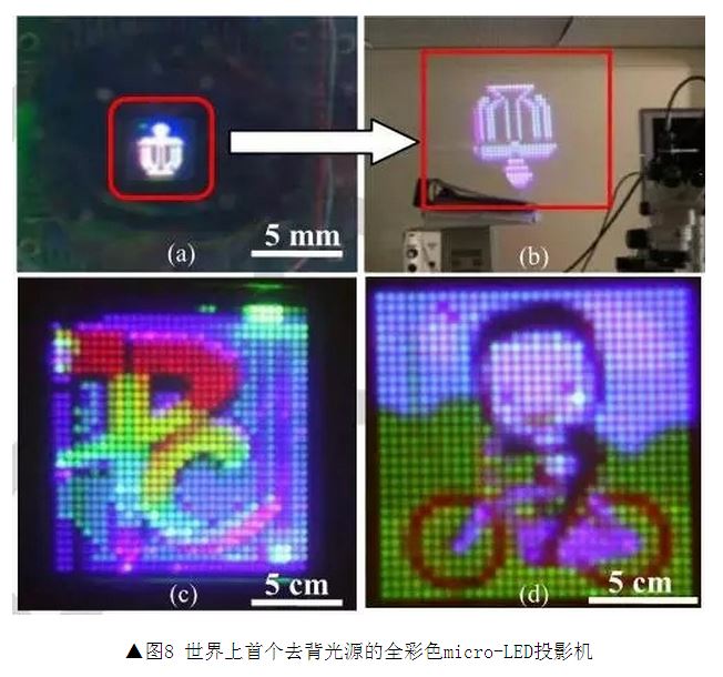 2009年,香港科技大學(xué)Z.J.Liu所在團(tuán)隊(duì)利用UVmicro-LED陣列激發(fā)紅綠藍(lán)三色熒光粉,得到了全彩色的微LED顯示芯片。2010年該團(tuán)隊(duì)分別利用紅綠藍(lán)三種LED外延片制備出360PPI的微LED顯示芯片[8],并把三個(gè)芯片集成在一起實(shí)現(xiàn)了世界上首個(gè)去背光源化的全彩色微LED投影機(jī)。