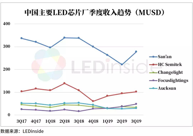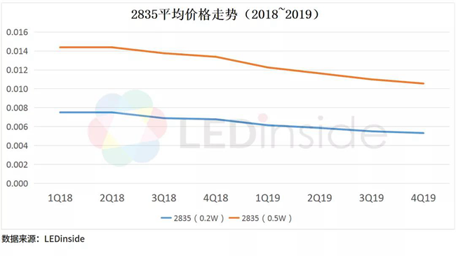 2019年由于中美貿(mào)易戰(zhàn)影響加深及全球新興市場(chǎng)需求疲軟,導(dǎo)致照明,背光等大宗需求明顯衰退,而新興應(yīng)用增長(zhǎng)乏力,屬于需求端出了問(wèn)題。封裝廠不得不持續(xù)降價(jià),以至于出現(xiàn)行業(yè)整體性衰退。
