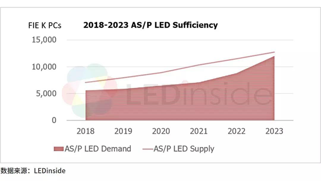 相比之下,用于紅光LED的砷/磷化物產(chǎn)能供過(guò)于求的程度較小,且紅光與藍(lán)色綠色在自發(fā)光顯示應(yīng)用中R:G:B以1:1:1比例固定,因此總體與顯示用氮化鎵呈現(xiàn)1:2的比例,與藍(lán)綠光產(chǎn)能有很強(qiáng)的互補(bǔ)性。mini和micro LED自發(fā)光顯示屏對(duì)紅光的需求邊際影響更為明顯,因此未來(lái)AS/P需求增長(zhǎng)的幅度也較藍(lán)綠光更大。
