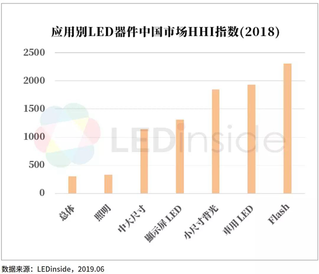 那么是不是集中度不提升就沒(méi)有機(jī)會(huì)了呢,結(jié)論是相反的。以LED封裝環(huán)節(jié)為例,整體的LED封裝環(huán)節(jié)的集中度非常低,HHI指數(shù)只有不到500(2018)。然而如果深入分析應(yīng)用別市場(chǎng),部分子行業(yè)由于進(jìn)入門檻高,玩家數(shù)量稀少,反而有著高于芯片的行業(yè)集中度。