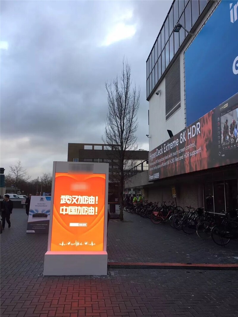 ISE展會第一天,展會人流量不錯,展館大門口竟然看到了“武漢加油!中國加油!”