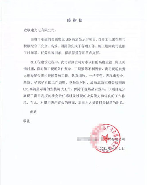 聯(lián)建光電的交付能力在行業(yè)內(nèi)一直保持領(lǐng)先地位,我們的標(biāo)桿裸眼3D案例——重慶美聯(lián)廣場(chǎng)項(xiàng)目就是一個(gè)很好的例子。該項(xiàng)目面積達(dá)2000㎡,被稱為“重慶之光”,如此大的屏體面積,聯(lián)電工程團(tuán)隊(duì)克服了高空作業(yè)難度,從生產(chǎn)到安裝交付僅用30天便完成,同時(shí)在春節(jié)及疫情期間,7X24小時(shí)全力確保項(xiàng)目正常運(yùn)行,該屏也在央視黃金時(shí)段被報(bào)道,至今顯示效果良好,并收到了客戶的感謝信,充分展示了裸眼3D視頻的震撼效果,為該商圈帶來大量人流。