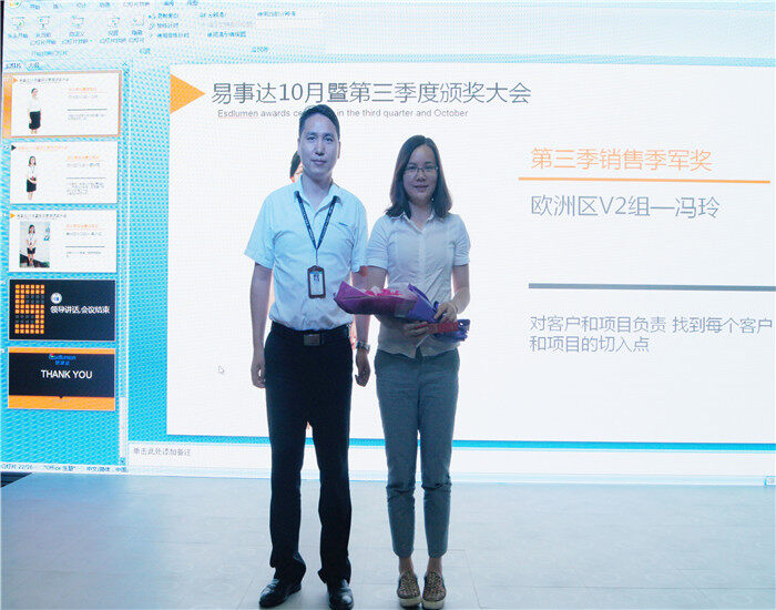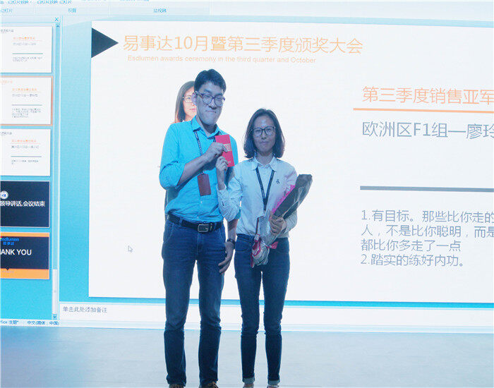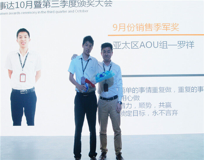 下面頒發(fā)“季度新秀獎(jiǎng)”,它是是針對(duì)入職未滿1年,在第三季度銷售額達(dá)到100萬或以上的新同事,且預(yù)收款不低于20%的銷售同事,即有機(jī)會(huì)獲得這一獎(jiǎng)項(xiàng)。在2016年第三季度,獲得此殊榮的是亞太區(qū)AOU組-張?jiān)L肖。張?jiān)L肖同事也出差在外,不能出席本次頒獎(jiǎng)。