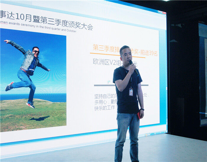 進(jìn)入我們的第三季度頒獎(jiǎng)環(huán)節(jié)。季度進(jìn)步獎(jiǎng)是以第二季度的業(yè)績(jī)?yōu)閰⒄?,在第三季度的銷售業(yè)績(jī)比第二季度每進(jìn)步一名,就可以獲得獎(jiǎng)勵(lì)50元。這次他前進(jìn)了39名,進(jìn)步最快,他就是歐洲區(qū)V2組程紅光。