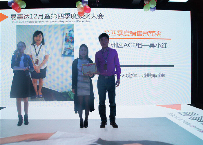 最后要頒發(fā)的是第四季度最重量級的獎項,就是2016年第四季度冠亞季軍獎。我們知道,銷售全憑真功夫,業(yè)績才是硬道理。現(xiàn)在市場競爭越來越激烈,在2016年第四季度三個月的努力奮戰(zhàn)中,我們營銷中心的每一位精英都付出了不懈的努力!而在當(dāng)中,有三位同事,在他們身上我們可以學(xué)習(xí)到寶貴的自身頑強(qiáng)、勤奮、百折不撓的拼搏精神。她們成為易事達(dá)銷售隊伍中的佼佼者,榮獲了第四季度的冠亞季軍!到底會是哪三位呢?現(xiàn)在我們來一一揭曉最后頒發(fā)的是第四季度冠亞季軍獎。