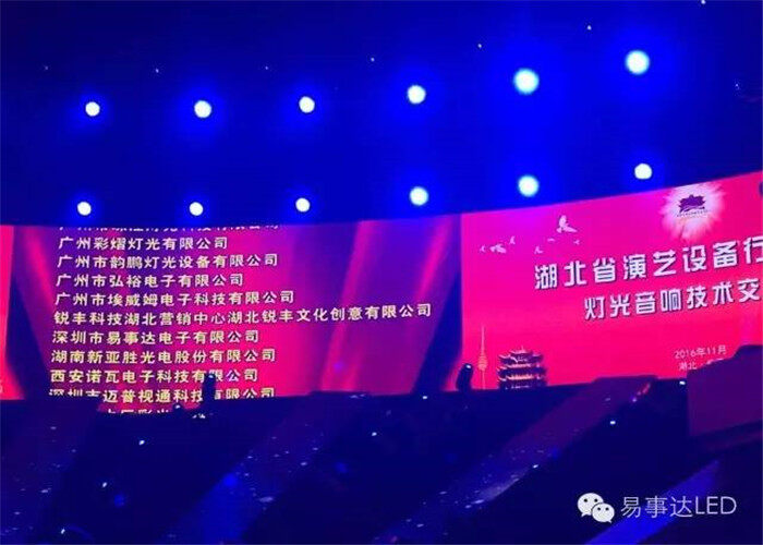 作為國(guó)內(nèi)知名的LED舞臺(tái)租賃屏專(zhuān)業(yè)制造商,易事達(dá)舞臺(tái)租賃屏產(chǎn)品在湖北演藝設(shè)備行業(yè)一直有著極高的知名度,本次應(yīng)邀出席演藝設(shè)備行業(yè)協(xié)會(huì)成立大會(huì),易事達(dá)也攜帶了炫彩plus產(chǎn)品亮相協(xié)會(huì)成立現(xiàn)場(chǎng)。