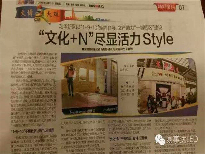 炫彩系列地板屏在展出的第一天,即引起《深圳都市報》的高度關注,5月13日該報在《“文化+N”盡顯活力style》專題新聞中對此進行了報道。