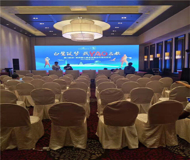 姚基金管委會(huì)委員陸浩及廈航總經(jīng)理助理陳立代表雙方簽訂簽訂合作備忘錄?;顒?dòng)現(xiàn)場顯示屏采用易事達(dá)輕翼系列Wing3 LED顯示屏.