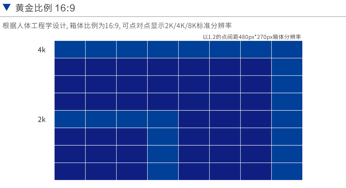 根據(jù)人體工程學(xué)設(shè)計(jì),箱體比例為16:9,可點(diǎn)對點(diǎn)顯示2K/4K/8K標(biāo)準(zhǔn)分辨率
