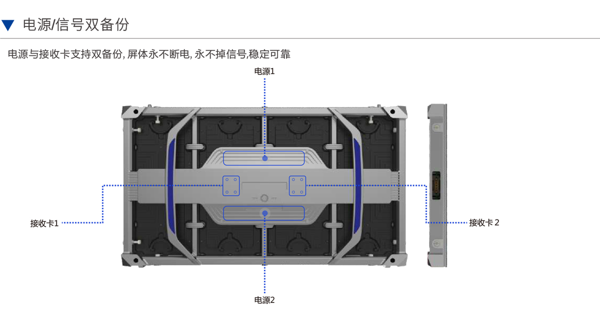 電源與接收卡支持雙備份,屏體永不斷電,永不掉信號穩(wěn)定可靠