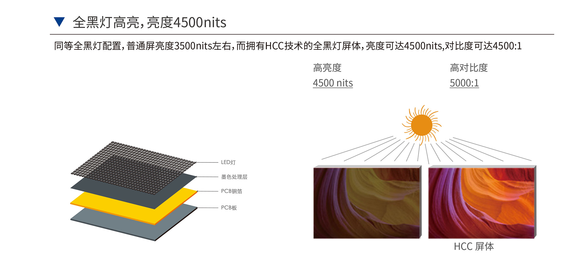 同等全黑燈配置,普通屏亮度3500nits左右,而擁有HCC技術(shù)的全黑燈屏體,亮度可達(dá)4500nits,對比度可達(dá)5000:1
