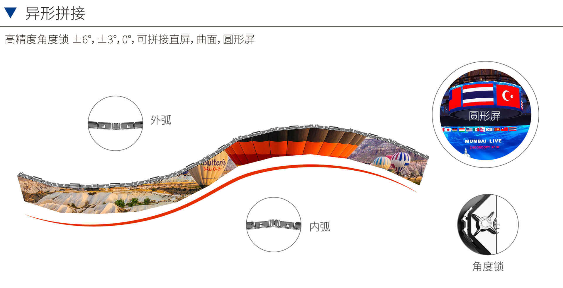 5. 異形拼接,可拼曲面/直屏/圓形屏,旋轉(zhuǎn)角度鎖即可調(diào)節(jié)拼接角度