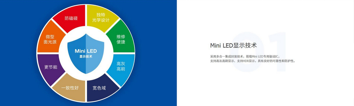 采用多合一集成封裝技術(shù),搭載 Mini LED專用驅(qū)動(dòng)IC,支持高灰高刷顯示、支持HDR顯示,具有良好的可靠性和防護(hù)性。