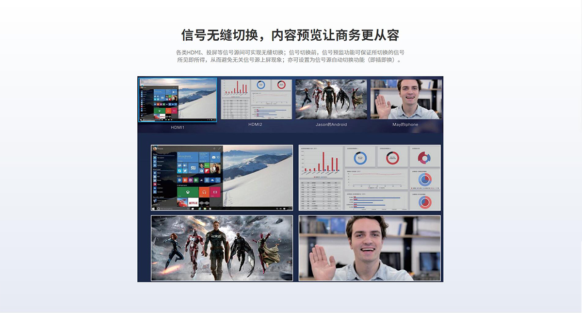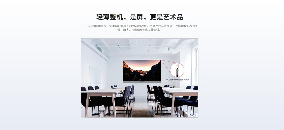 超薄屏體結構,完美貼合墻面;極致超薄邊框,盡顯現(xiàn)代商務風范;現(xiàn)場模塊化快速安裝,兩人2小時即可完成安裝調試。