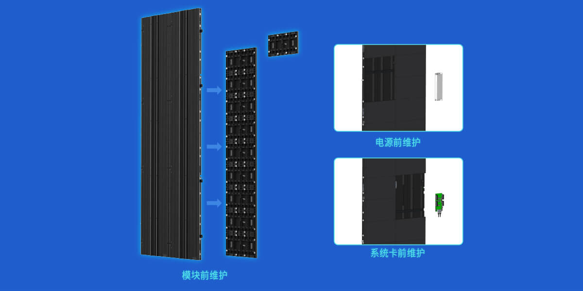 模塊、系統(tǒng)卡、電源均可從屏體正面進(jìn)行維護(hù),背后無需預(yù)留維護(hù)空間